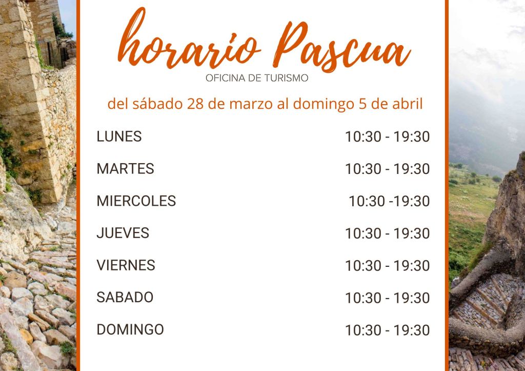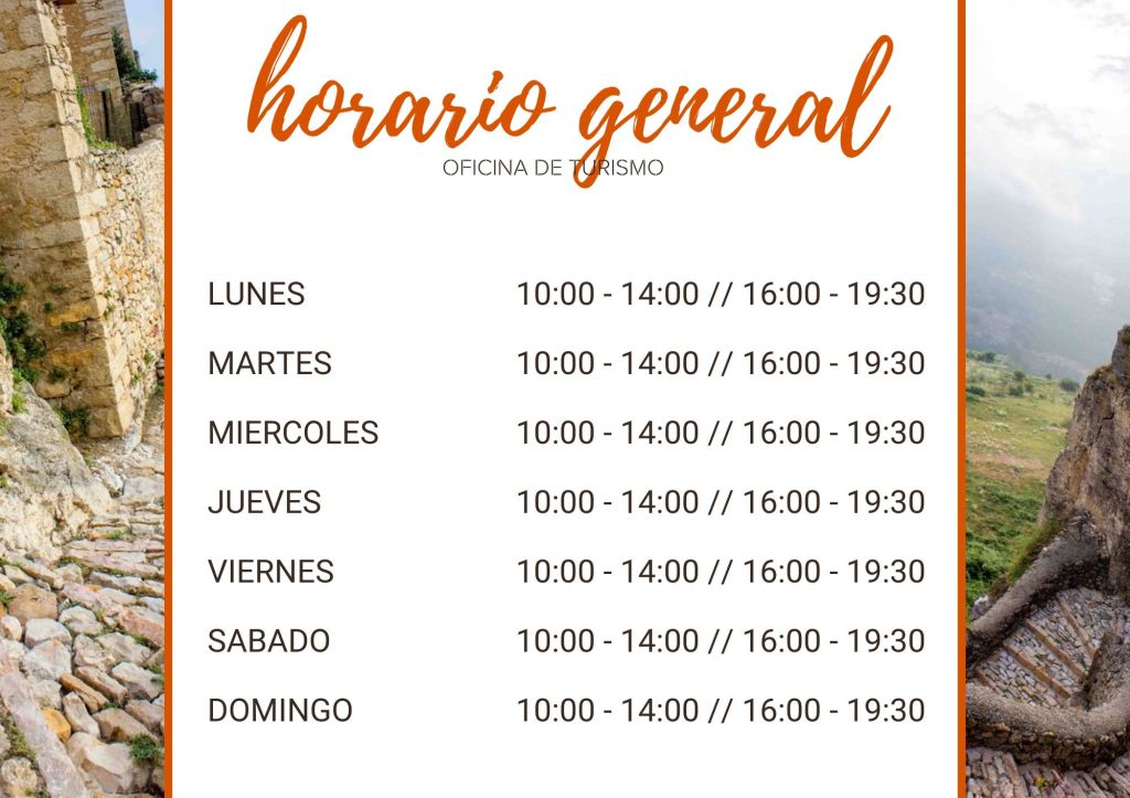 Horario Oficina de Turismo PUENTES Y FESTIVOS EL HORARIO PUEDE VERSE MODIFICADO. CONSULTAR PREVIAMENTE. CONTACTANDO AL 678 340 228