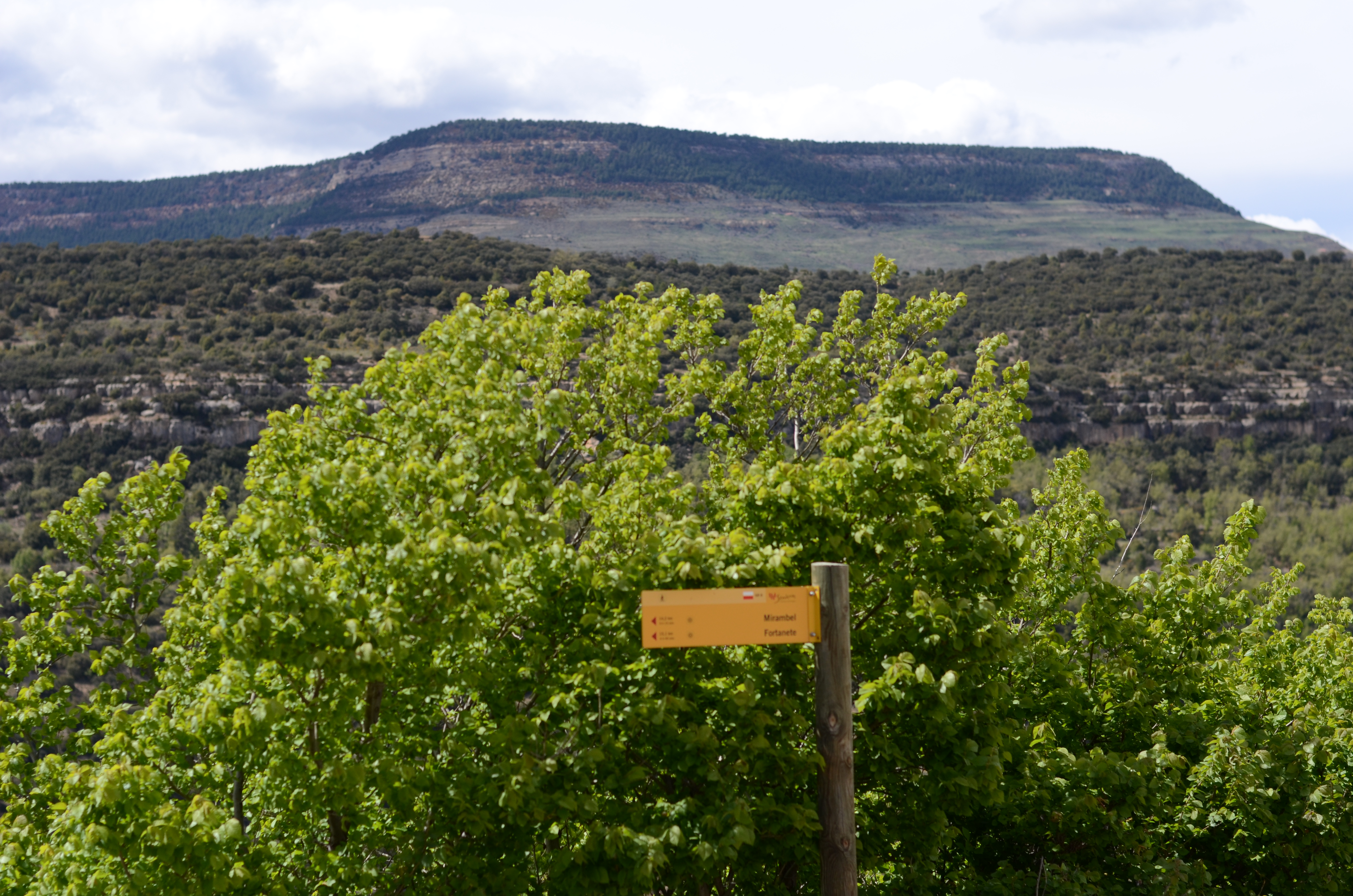Se toma la carretera de Mirambel y, a la salida del pueblo, nace a la izquierda un sendero señalizado con marcas blancas y rojas (antiguo GR-8, dirección Fortanete) que discurre a media ladera acercándose al río Cantavieja. Al llegar al río se han recorrido casi 2 km. Aquí tomar el camino señalizado con marcas blancas y amarillas (PR-TE 68) que transcurre, en su mayor parte , por una pista asfaltada para más adelante ascender por una calzada que nos devuelve a Cantavieja.